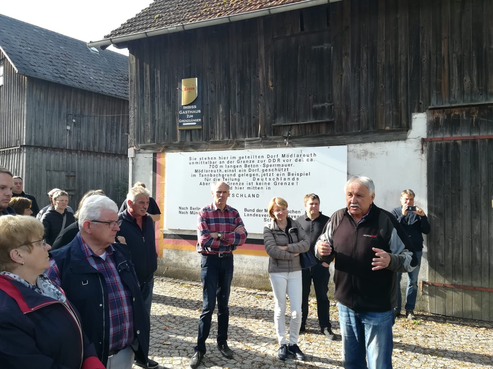 In den frühen Morgenstunden am 6. Oktober starteten wir unseren Ausflug nach Mödlreuth. Der Ort, auch Klein-Berlin genannt, wurde zur Zeit der DDR durch die Mauer getrennt. Auch heute ist das Dorf noch zweigeteilt, so gibt es eine bayrische und eine thüringsche Hälfte. Kontaktverbot besteht für die 47 Einwohner heute natürlich nicht mehr und auch die Ausgangssperren gehören der Vergangenheit an. Erschreckend war zu sehen, welche Maßnahmen ergriffen wurden die Bürger der DDR an einer Flucht in den Westen zu hindern. Neben Wachpersonal und Hundeposten setzte die DDR-Führung auch auf Minen und Sprengfallen. Trotzdem gelang es einigen in den Westen zu flüchten, auch im Grenzverlauf von Mödlreuth.