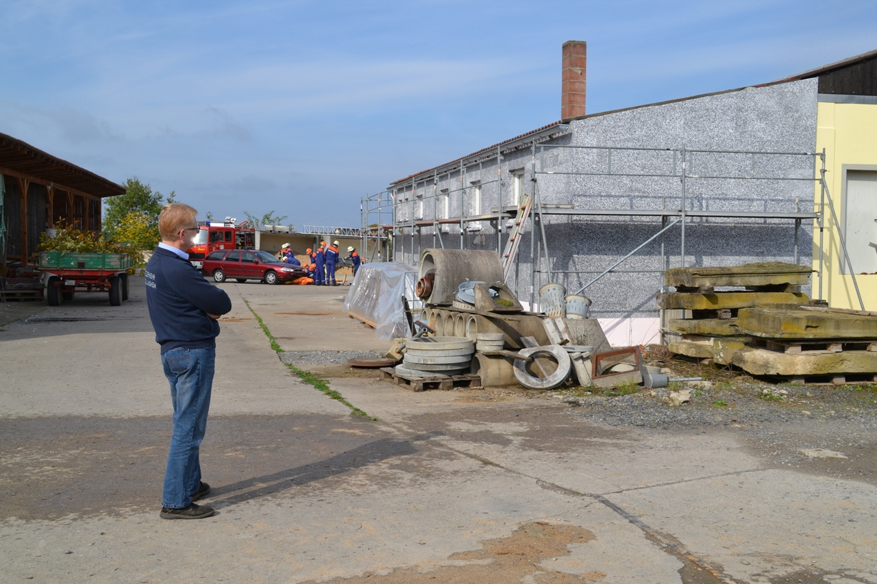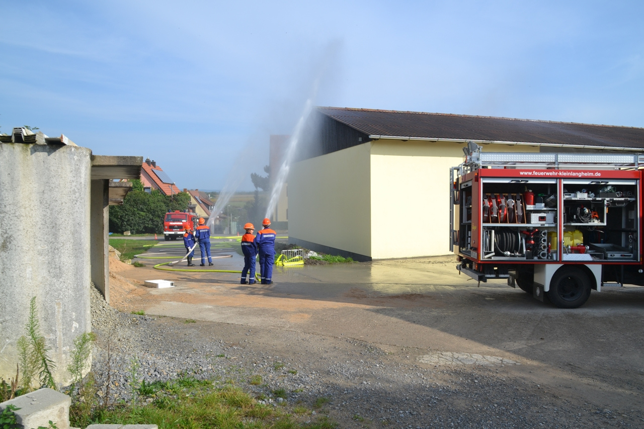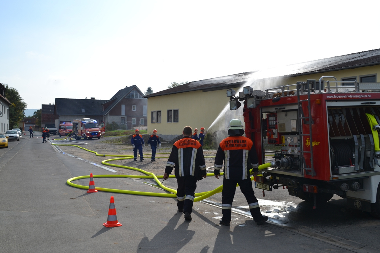 Das Übungsszenario war ein Brand im Kleinlangheimer Bauhof, der zusätzlich zu einem Verkehrsunfall geführt hat. Des Weiteren musste eine vermisste Person gefunden werden, die das Brandobjekt fluchtartig unter Schock verlassen hatte.
