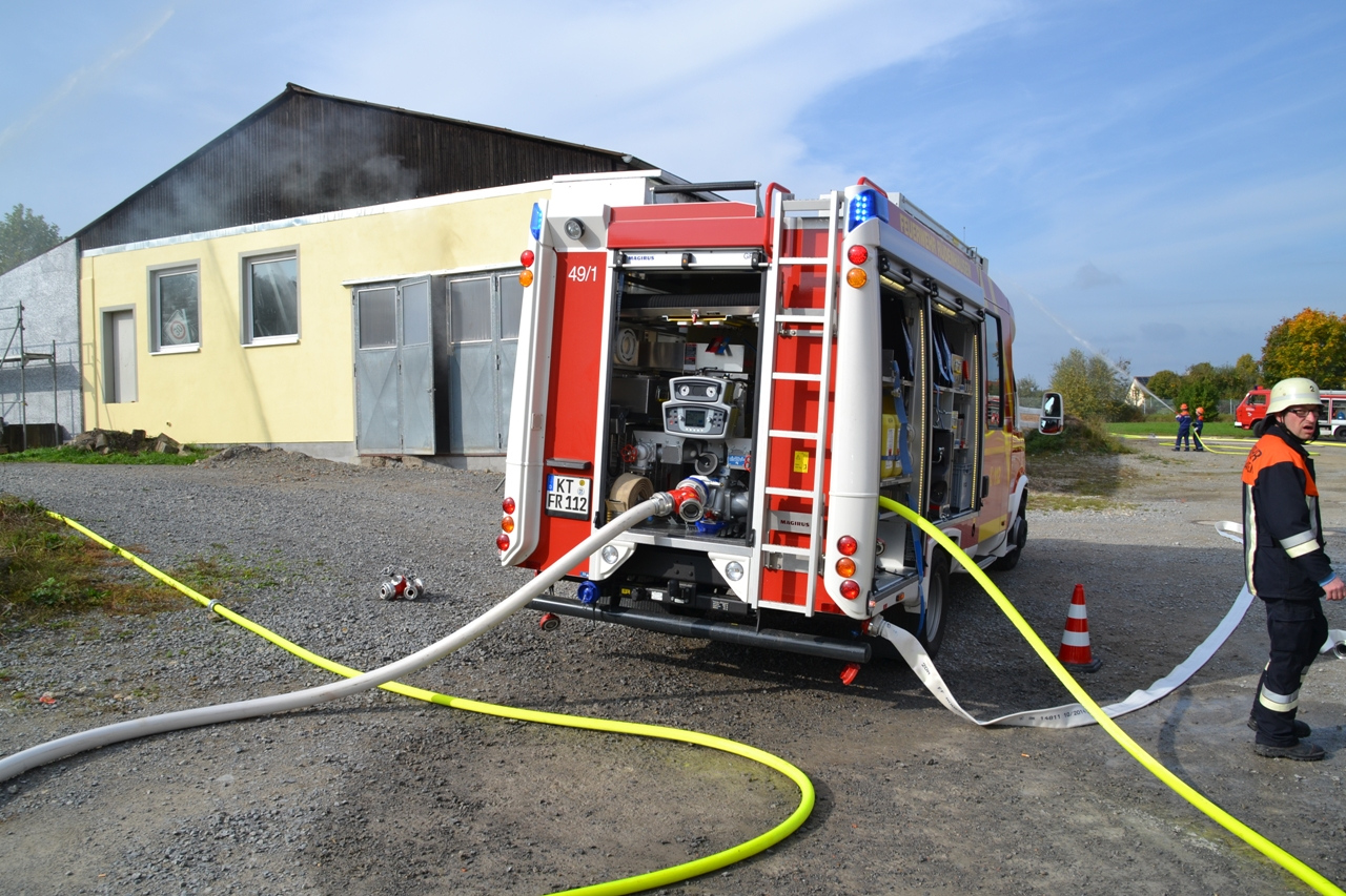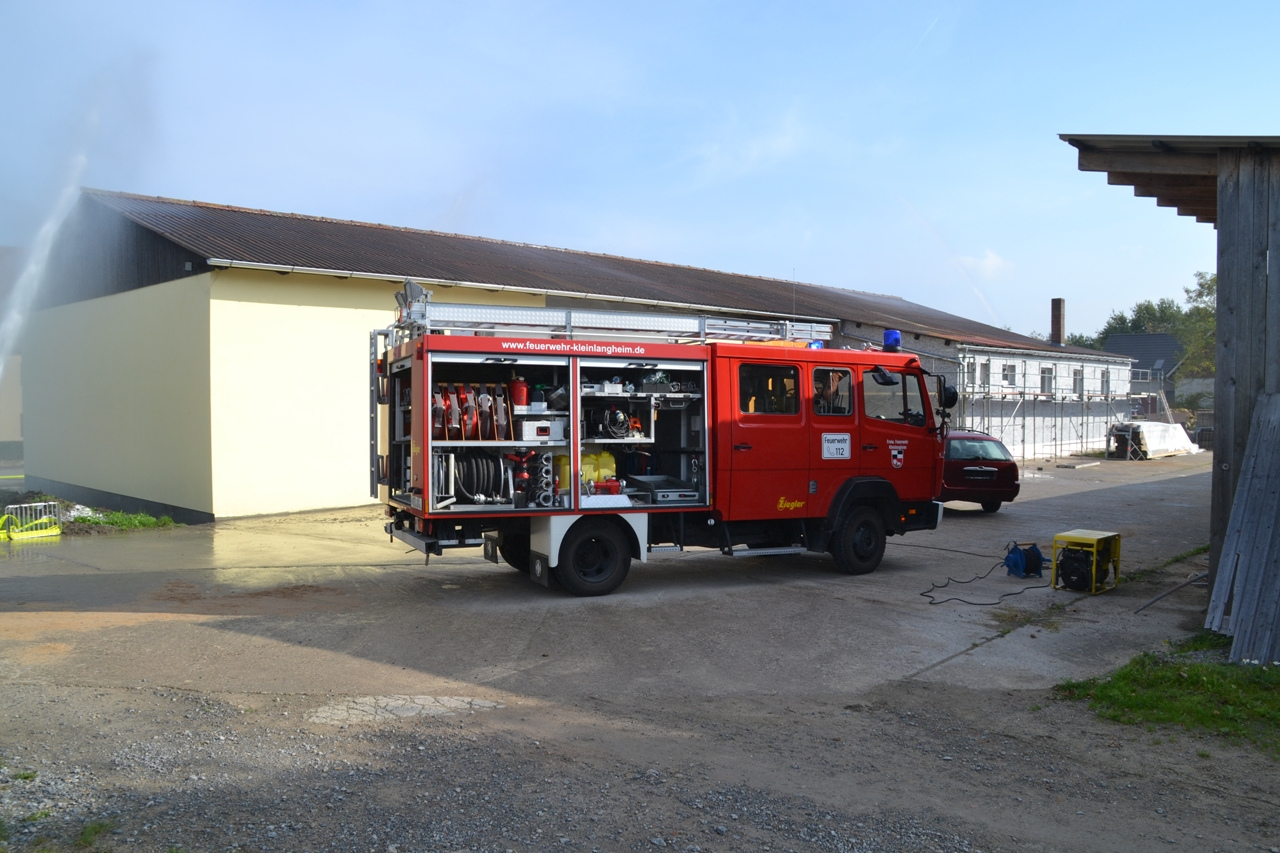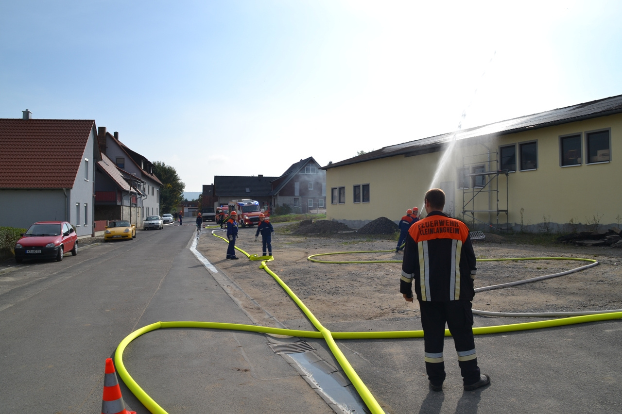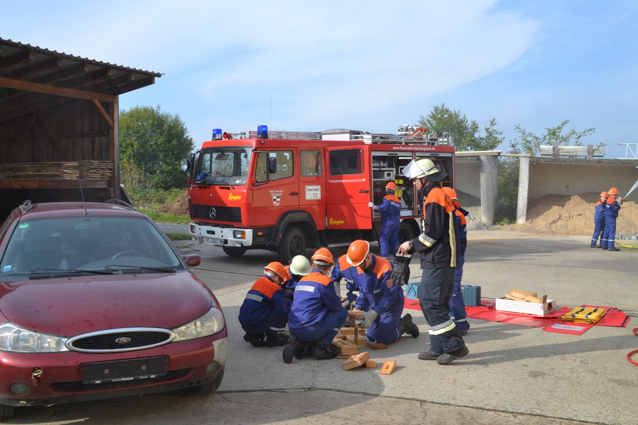 Das Übungsszenario war ein Brand im Kleinlangheimer Bauhof, der zusätzlich zu einem Verkehrsunfall geführt hat. Des Weiteren musste eine vermisste Person gefunden werden, die das Brandobjekt fluchtartig unter Schock verlassen hatte.