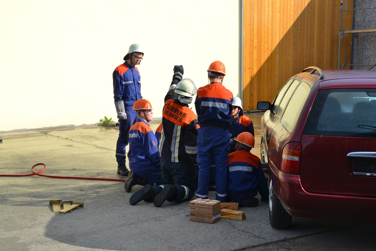Die ältere Gruppe aus Kleinlangheim war mit dem Abarbeiten des Verkehrsunfalles beschäftigt, während unsere jüngere, sowie die Rüdenhausener den Brand bekämpften. Zusätzlich dazu machten sich je zwei Jugendliche aus beiden Orten dazu auf, die vermisste Person zu finden.