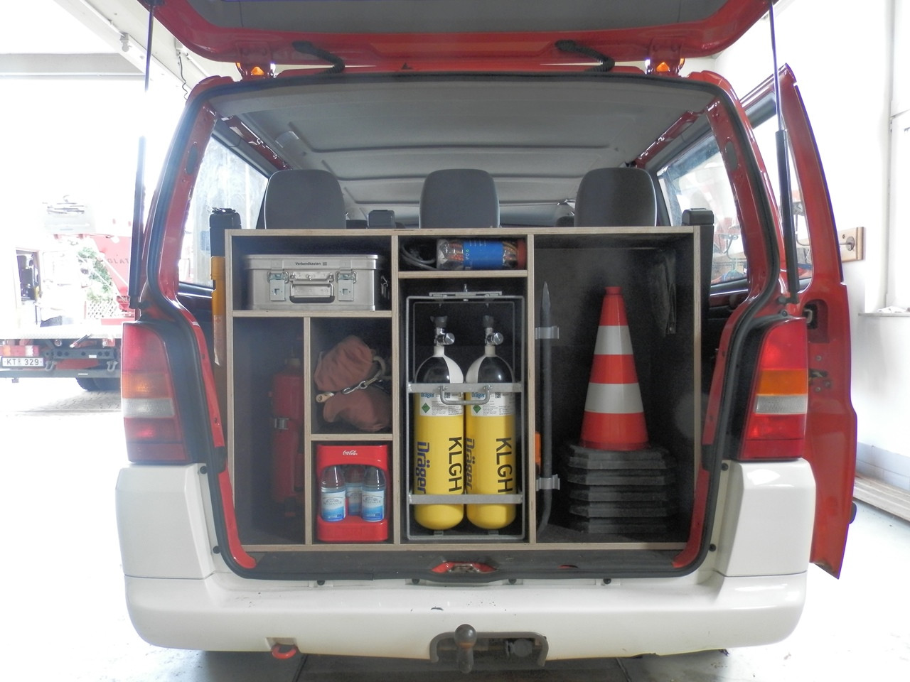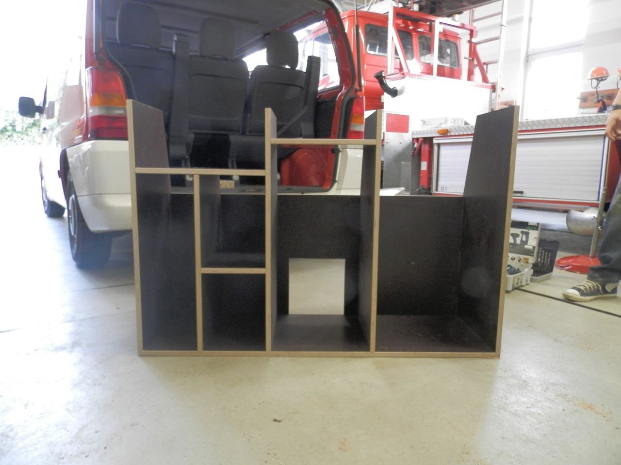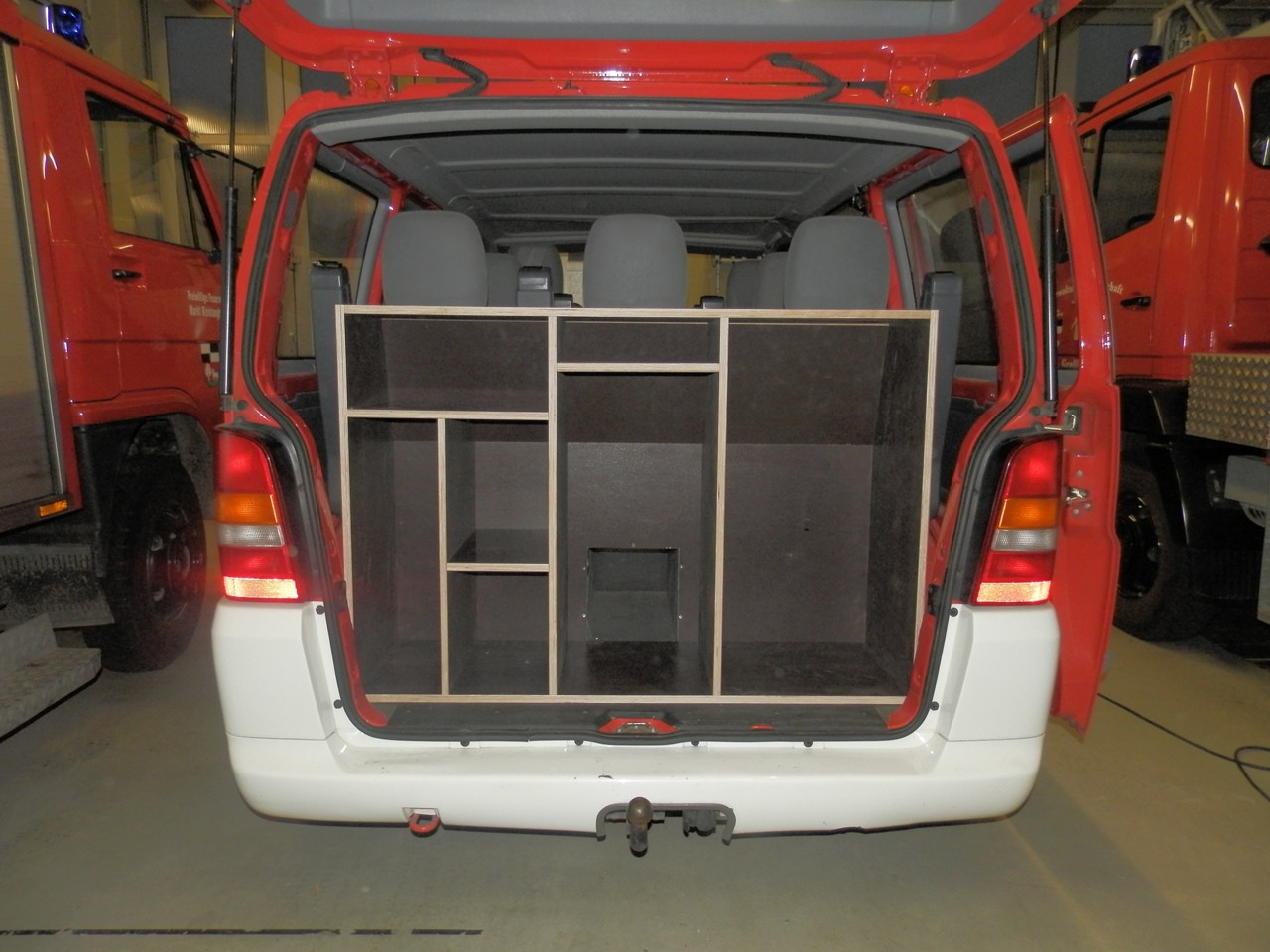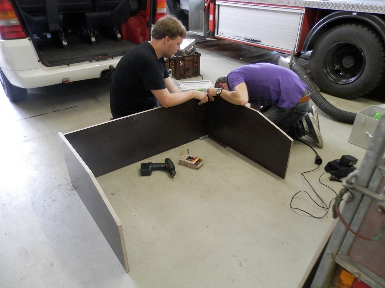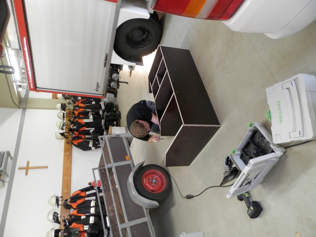 Um den Einsatzwert unseres MZF zu steigern, haben wir uns dazu entschlossen in Eigenregie einen Ausbau anzufertigen. Bislang ergab sich das Problem, dass, aufgrund fehlender Verstaumöglichkeiten, wenig Ausrüstung mitgeführt werden konnte. Bisher fand einsatzrelevante Beladung in einer kleinen Kiste Platz. Um diesen Umstand zu ändern liefen Anfang Juli die Planungen zum Ausbau des Kofferaumes an. Anfang August konnte das Vorhaben dann in der Praxis angegangen werden. Hierzu lieferte uns die ortsansässige Schreinerei die zugesägten Platten. Die Montage des Korpus, sowie das Einlassen in das Fahrzeug, übernahmen drei Kameraden der Wehr.
